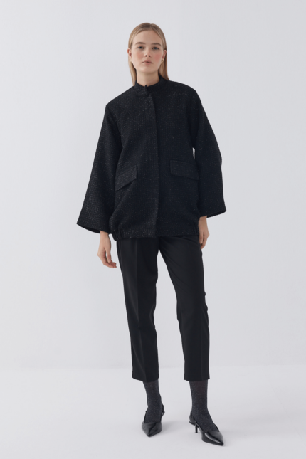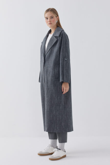 Eva kaban, estetik açıdan da dikkat çekici bir tasarıma sahiptir. Kolda yer alan şık düğme detayı, klasik kesimi modern bir dokunuşla yeniler. Bu zarif detay, kabanın sade ama etkileyici görünümünü pekiştirirken, küçük ama önemli bir şıklık katmanı sunar. Kolda düğme detayı, bu kabanı diğer dış giyim ürünlerinden ayıran ince ve zarif bir dokunuştur.