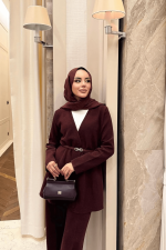 Takım; bel kısmındaki ince kemer detayıyla bel hattını vurgular, düz kesim pantolonuyla ise uzun ve zarif bir siluet oluşturur. Nefes alabilen yapısı sayesinde her mevsim rahatlıkla kullanabileceğiniz bu model, hem klasik hem modern kombinlere uyum sağlar.