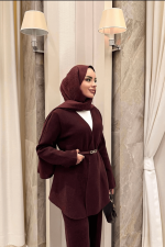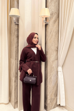Zarif ve modern çizgileriyle öne çıkan bu üç parçalı takım, şehirli kadının gardırobuna sofistike bir dokunuş katıyor. Yumuşak dokulu, dökümlü kumaşı sayesinde gün boyu konfor sunarken, minimal tasarımıyla işten özel davetlere kadar her ortamda zarafetinizi tamamlar.